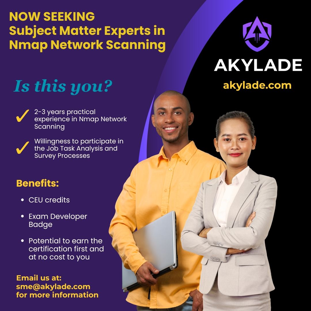 AKYLADE is seeking Subject Matter Experts (SMEs) to help develop an upcoming certification focused on the Nmap Network Scanning process —one of the most powerful network scanning tools in cybersecurity. This is a unique opportunity to contribute your expertise, set industry standards, and help create a certification that will enhance the skills of cybersecurity professionals worldwide.